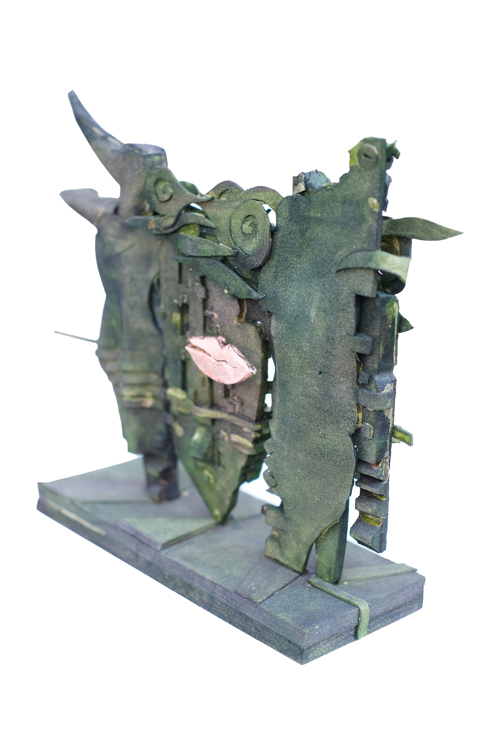 In this striking sculpture composition, the bird-headed figure on the left represents Memory striving to rise toward the heavens, while the figure on the right, with its sharper and more angular lines, embodies Time. At the center lies the labyrinthine "House of Secrets," serving as a universal archive for unspoken words and unlived stories. According to mythology, when the conflict between Time—which seeks to erase all—and Memory—which strives to preserve every moment—disrupted the cosmic balance, the Gods imprisoned these two forces within this house built between them. The copper strips and layers upon the surface act as "Time Lines," representing the thousands of years passed in this silent vigil, weaving a secret map of remembrance that binds the figures to each other and the earth. The golden lips shining at the very heart of the house represent a sealed truth, suggesting that profound realities can only be heard in silence, and serve as the common "word" connecting these two opposing forces. Artistically, this detail stands out against the green-patinaed, hardened world of the sculpture, employing a surrealist touch that prompts the viewer to ask, "If this structure could speak, what would it tell?" thereby transforming the piece into a listening subject. According to the end of the legend, when these lips one day whisper the "Name of the Forgotten," Memory will take wing, Time will stand still, and all the secrets hidden within the copper details will transform into absolute truth.