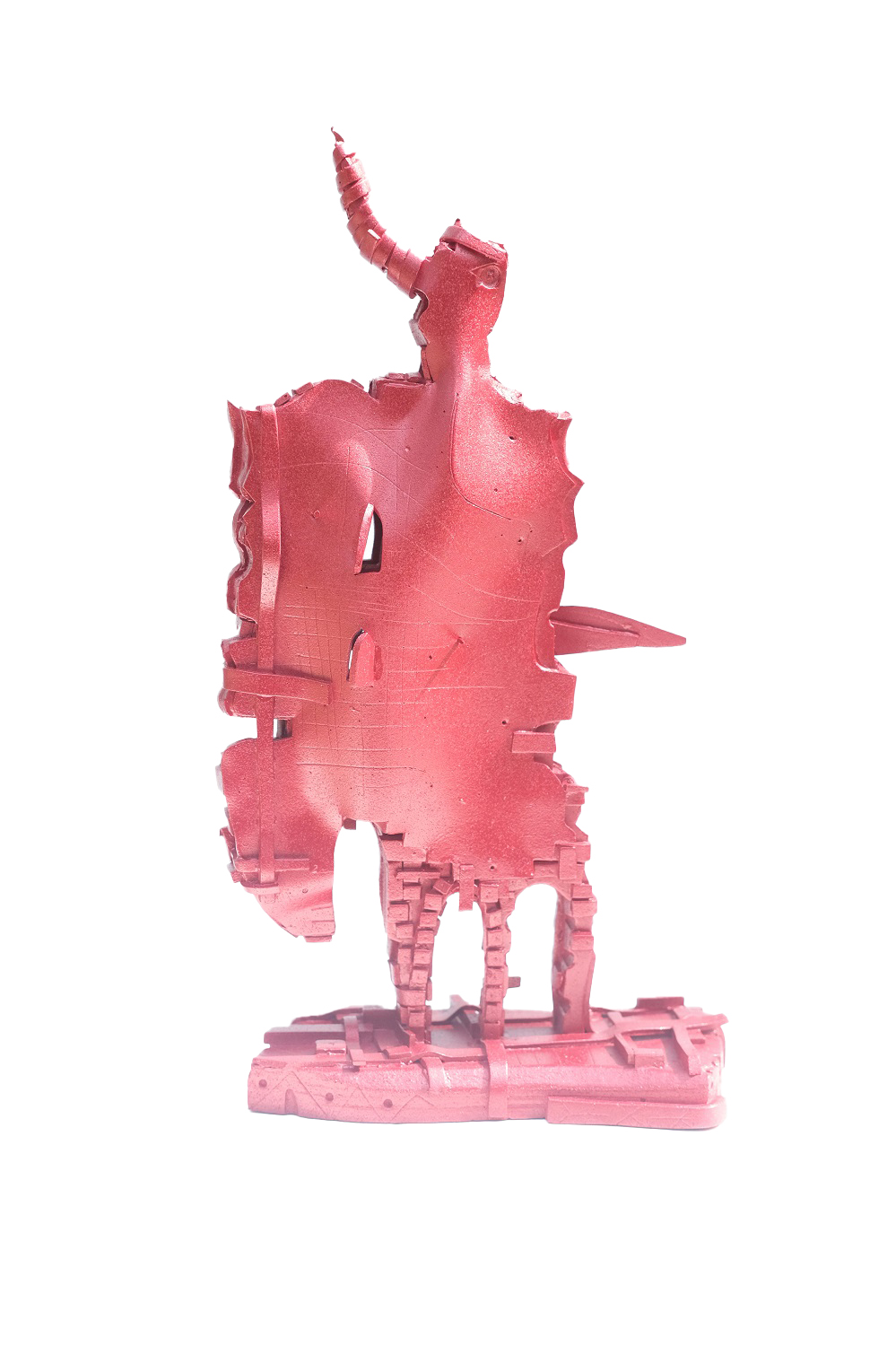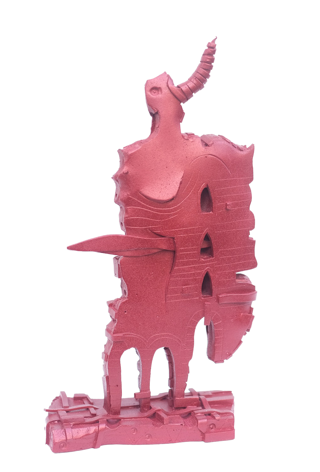 This sculpture, titled Mars, embodies the unwavering will and protective armor of the Roman god of war through a fiery energy rising in a vertical form. The dominant red texture serves as a direct link to the Red Planet—the symbol of Mars—and the fury of battle; this color represents life force, passion, and relentless resilience. As the sculpture’s verticality reaches toward the sky like a spear, signifying strategic intellect, the intricate recesses upon its body symbolize that war is not merely brute force, but also a complex internal struggle. At the summit, the eye detail, crowning the piece like a helmet, merges the ever-watchful gaze of the god Mars with contemporary concepts of awareness, transforming the work into a timeless totem of power and protective vigilance.