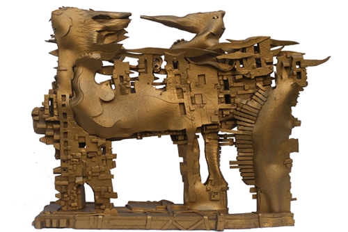 Sanatçının geri dönüşüm malzemelerini değerlendirerek girift biçimde istiflediği illüstrasyonları cisimleştirerek, cesur ve baskın renklerle heykele dönüştürdüğü bir yapıt serisi "Kent Katmanları". Bütüne bakıldığında sembolik bir kurguyu öne çıkarıyor.