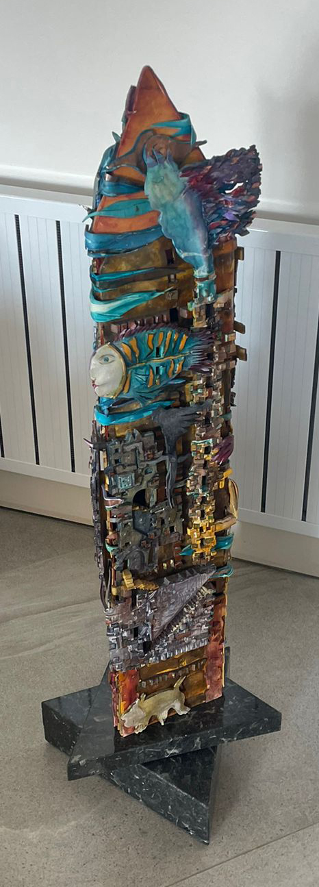 Düşler tanrısı "Morpheus"un adını taşıyan bu heykel, Kent Katmanları serisinin arkeolojik derinliğini mitolojik bir rüya alemiyle buluşturuyor. Bakır, taş ve demir gibi malzemelerin ham ve kadim dokusu, sanki bir şehrin toprağın altına gizlenmiş hafızasını dikey bir sütun halinde gün yüzüne çıkarıyor. Tamamen el işçiliğiyle boyanmış yüzeyde, toprağın ve sarının sıcak tonları medeniyetin köklerini sağlamlaştırırken; aralara sızan mistik morlar, derin maviler ve tutkulu kırmızılar rüyaların ele avuca sığmaz doğasını simgeliyor. Bu renk armonisi içinde birbirine geçmiş mimari unsurlar, insan ve hayvan figürleriyle kaynaşırken; kompozisyona eklenen sürreal gözler ve uçan dudaklar, Morpheus'un fısıltıları gibi maddenin katı gerçekliğini kırarak eseri fiziksel bir buluntudan çok, bilinçaltının sanatsal ve şiirsel bir tezahürüne dönüştürüyor.