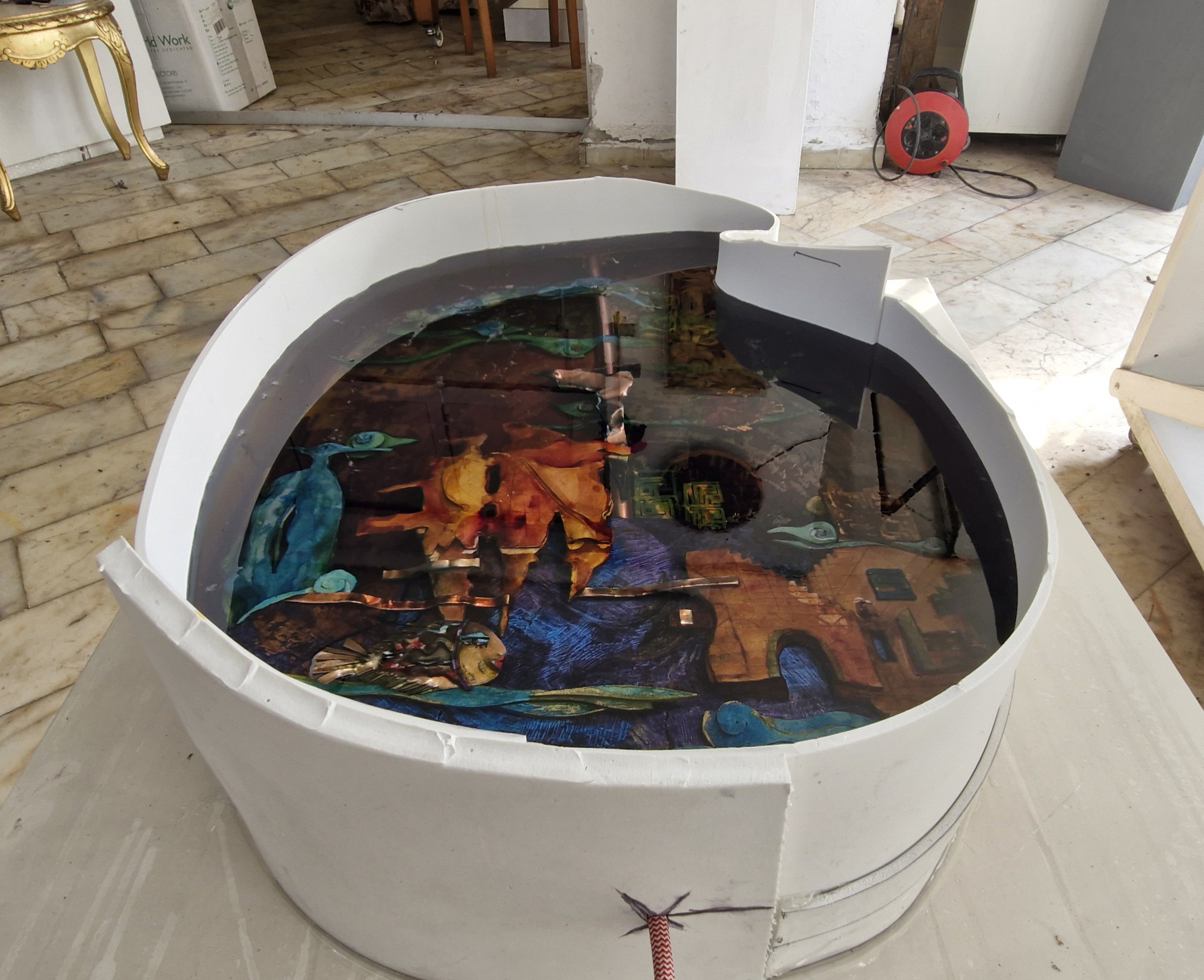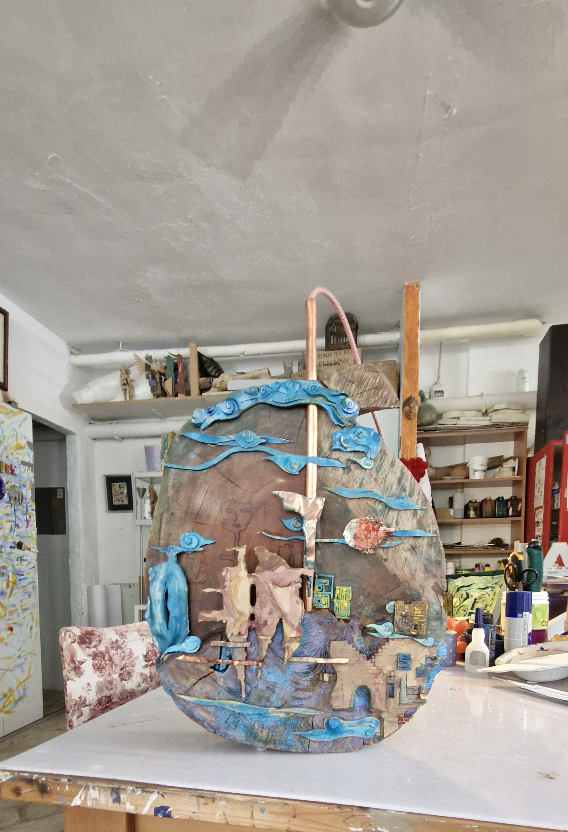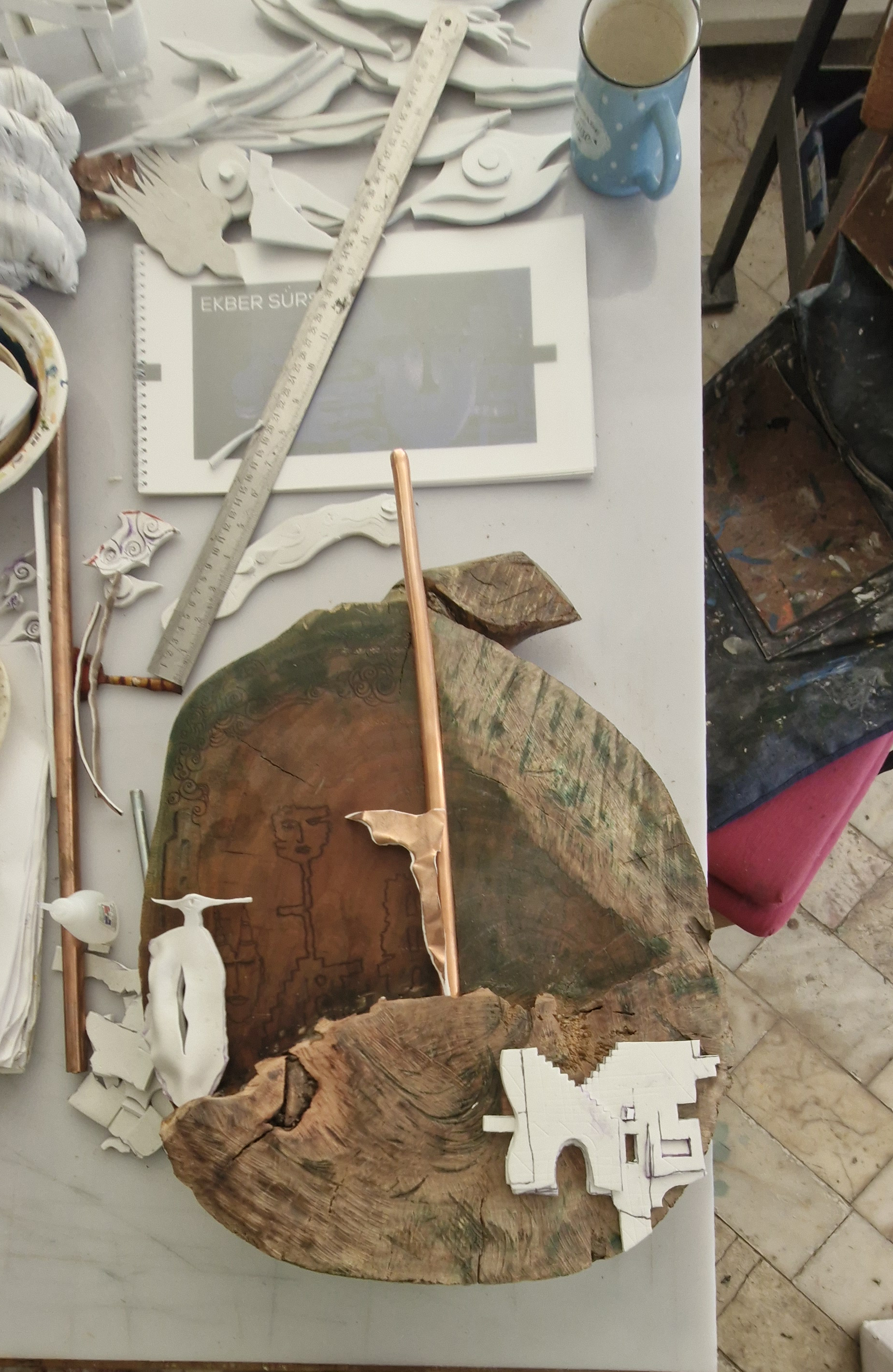 10x38x85 cm., 2024, kestane ağacı, etilen vinil asetat, bakır, reçine döküm, mix media el boyaması